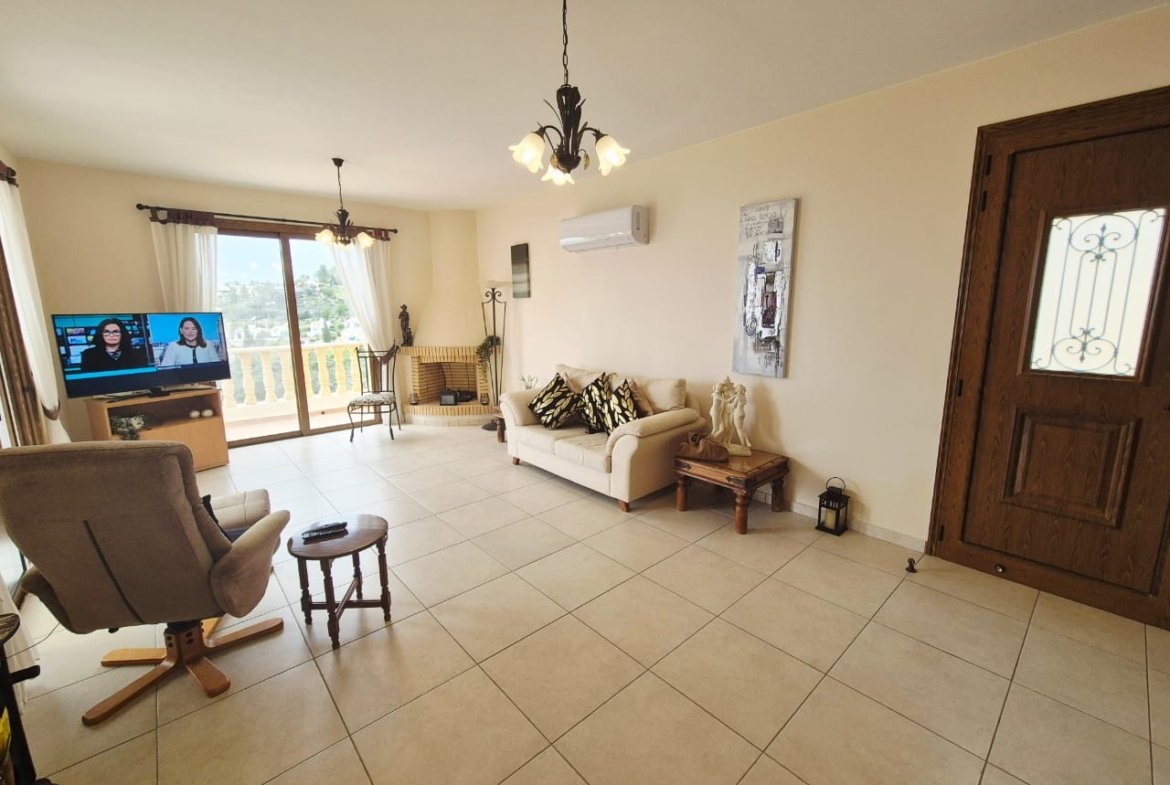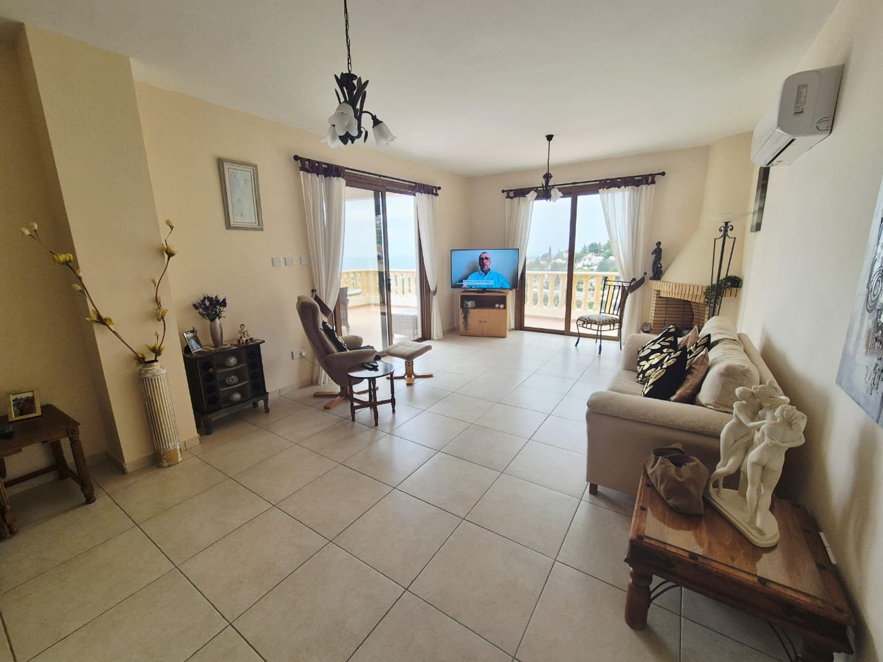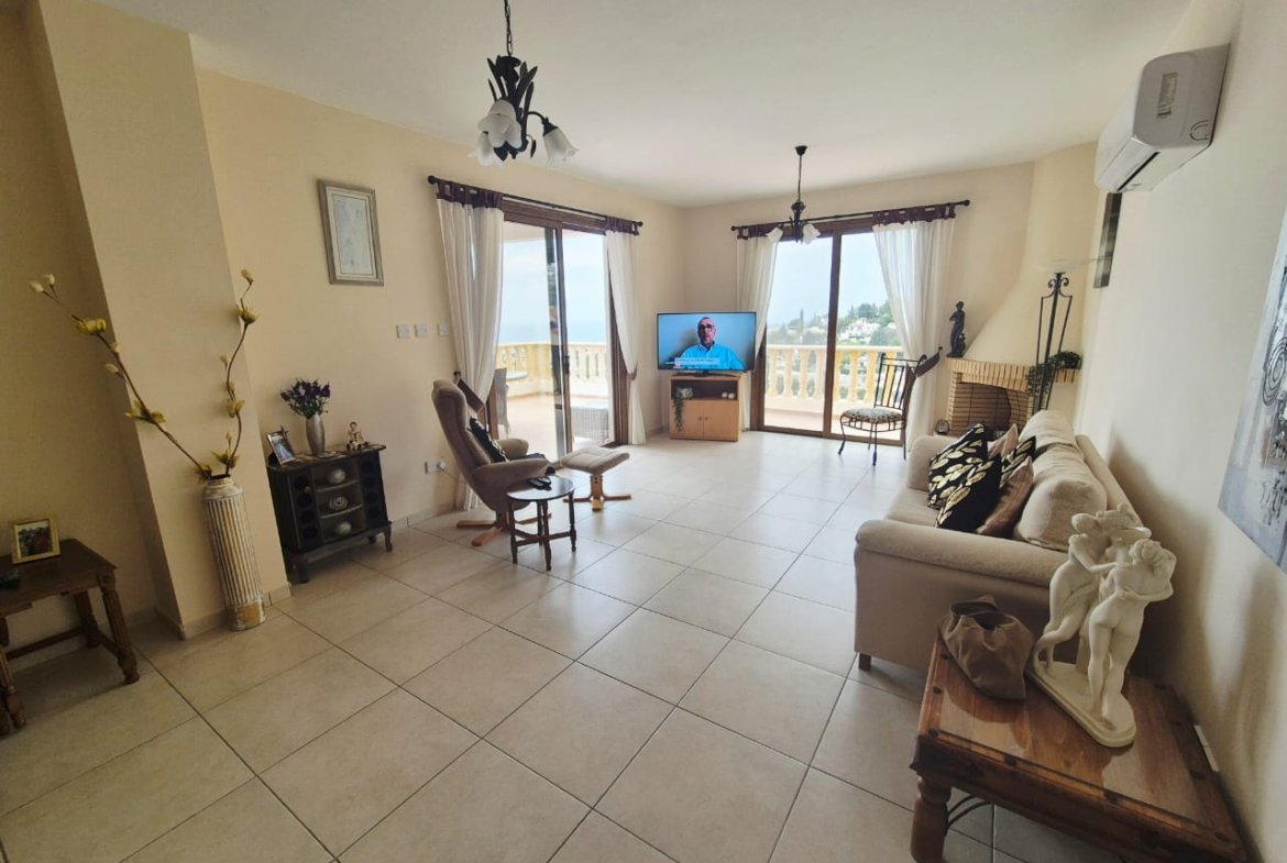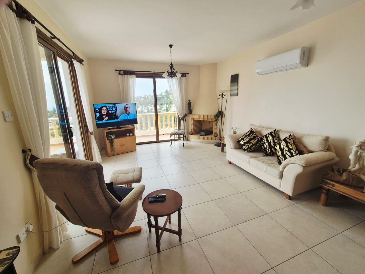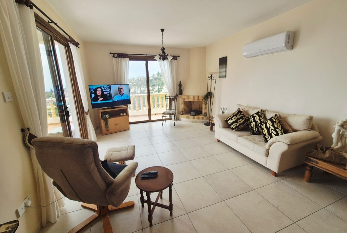 As you enter the villa, you walk into the open plan living room with a working fireplace and patio doors leading out to the balcony with amazing sea views.