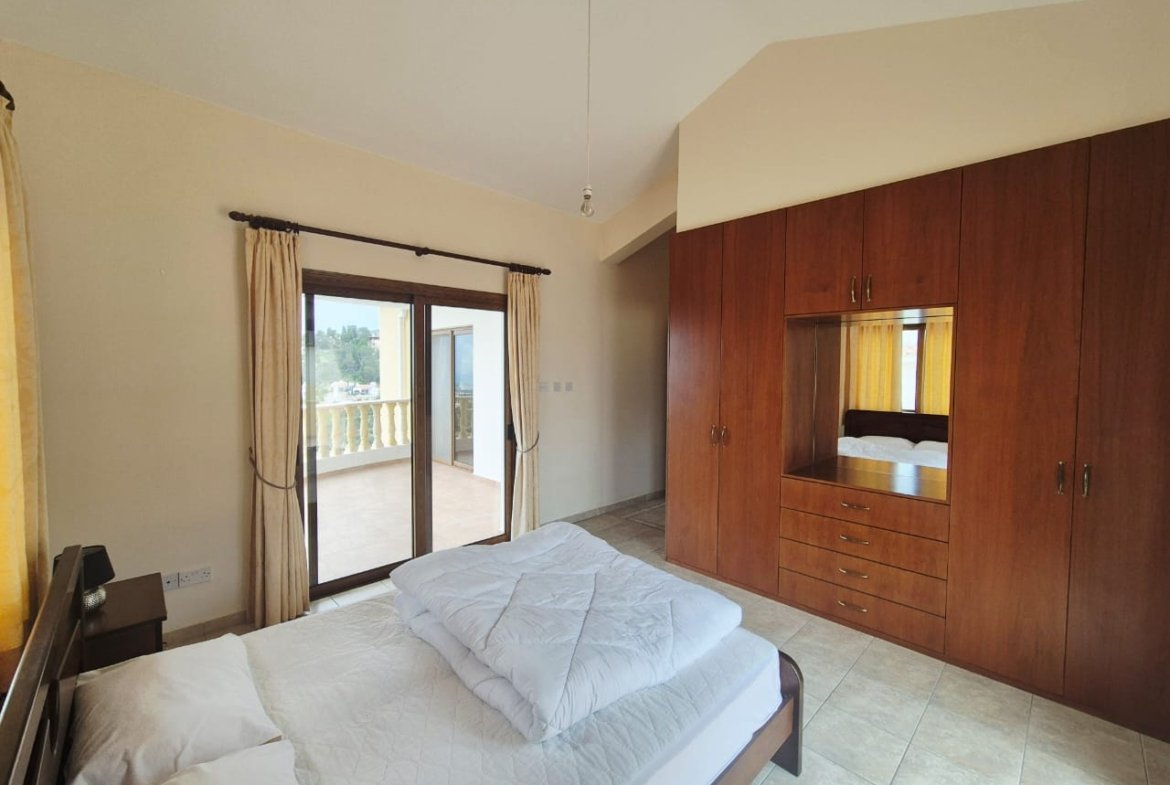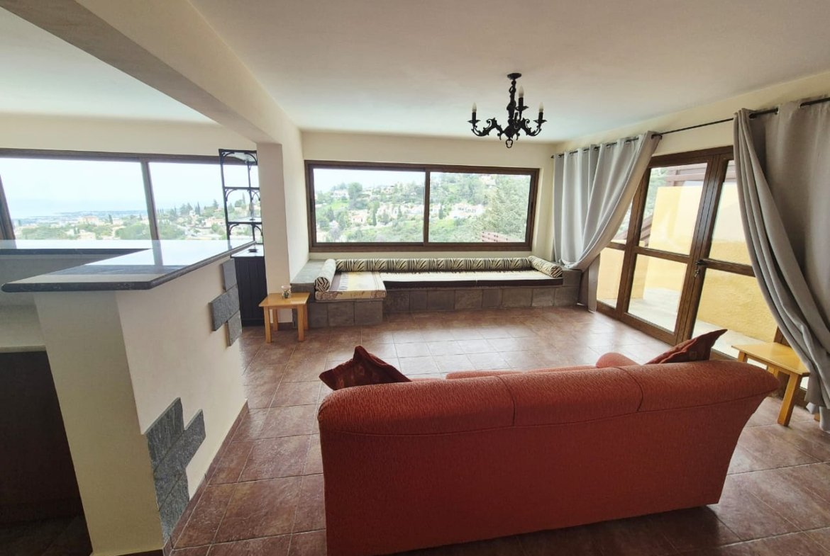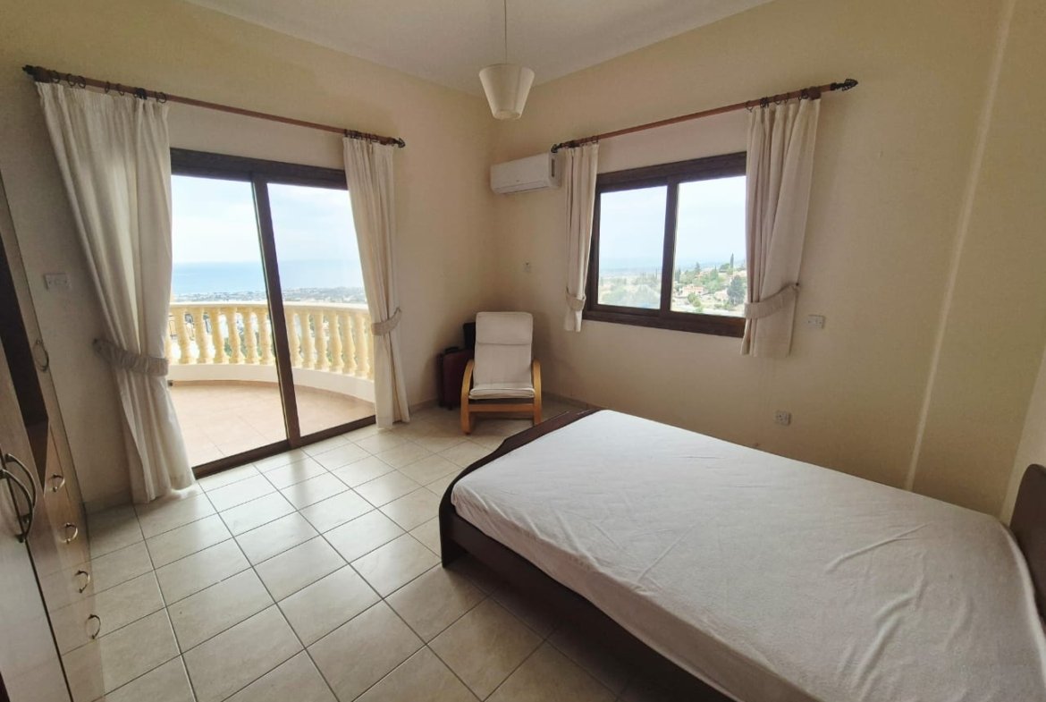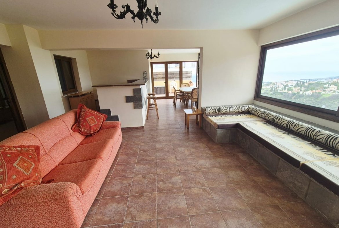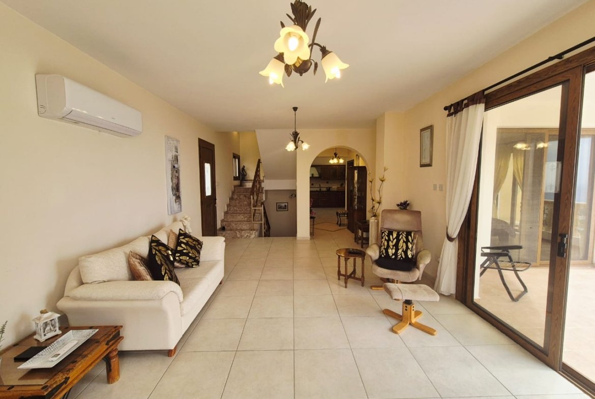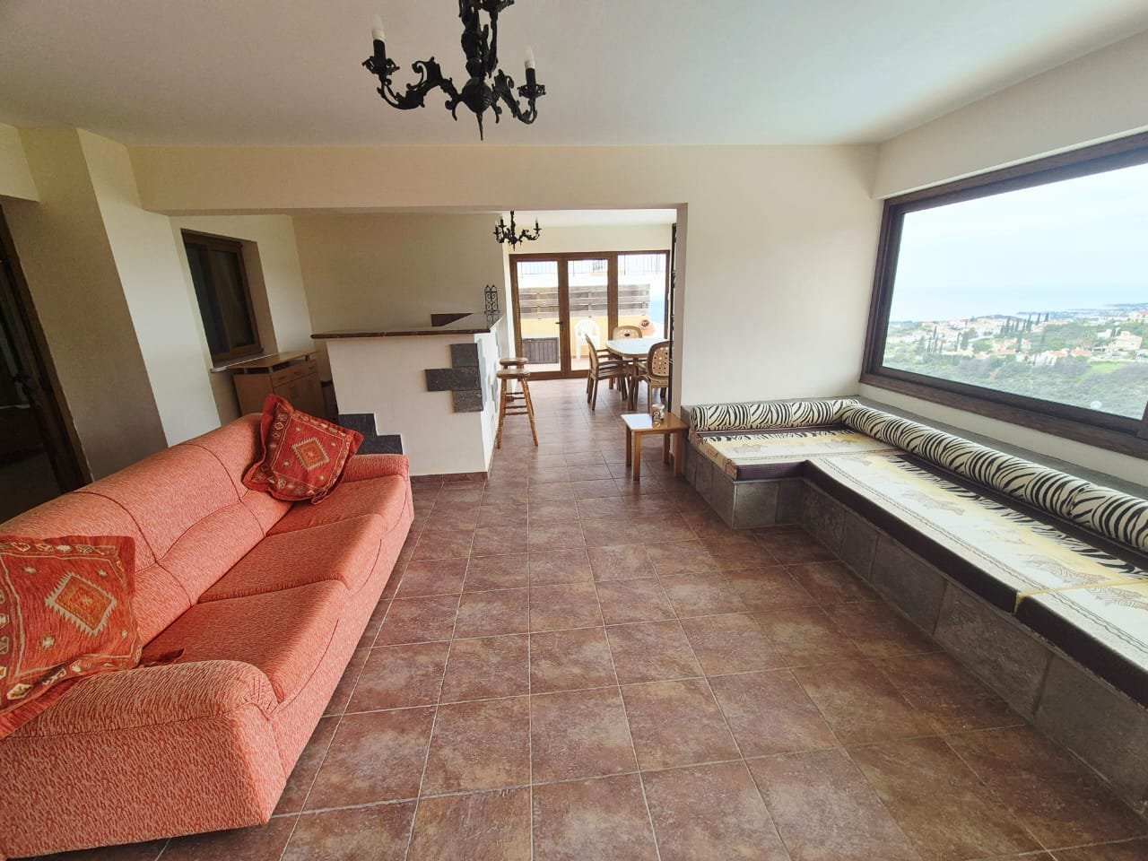 As you enter the villa, you walk into the open plan living room with a working fireplace and patio doors leading out to the balcony with amazing sea views.