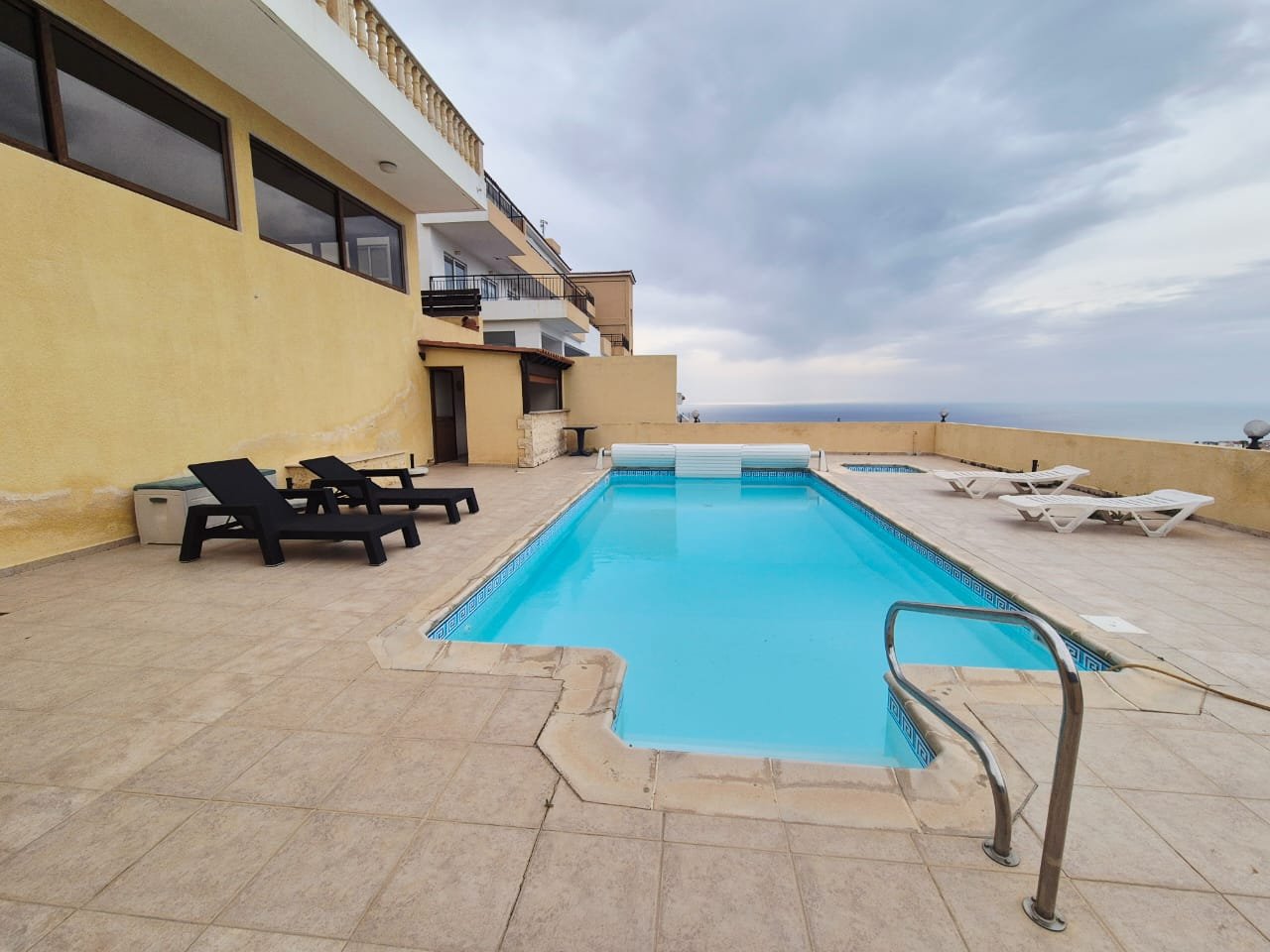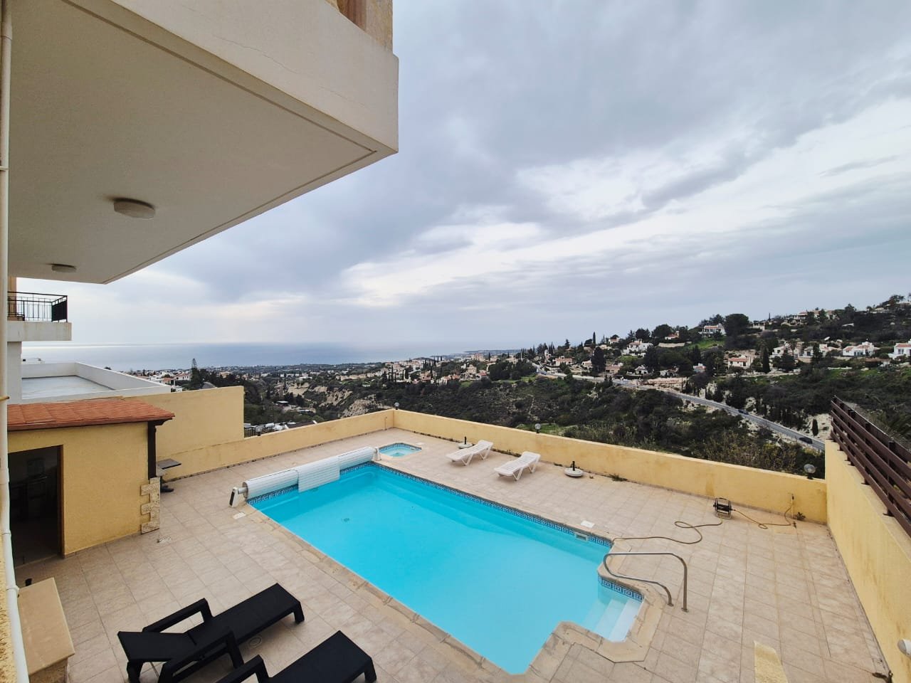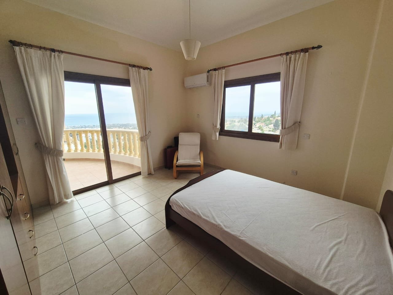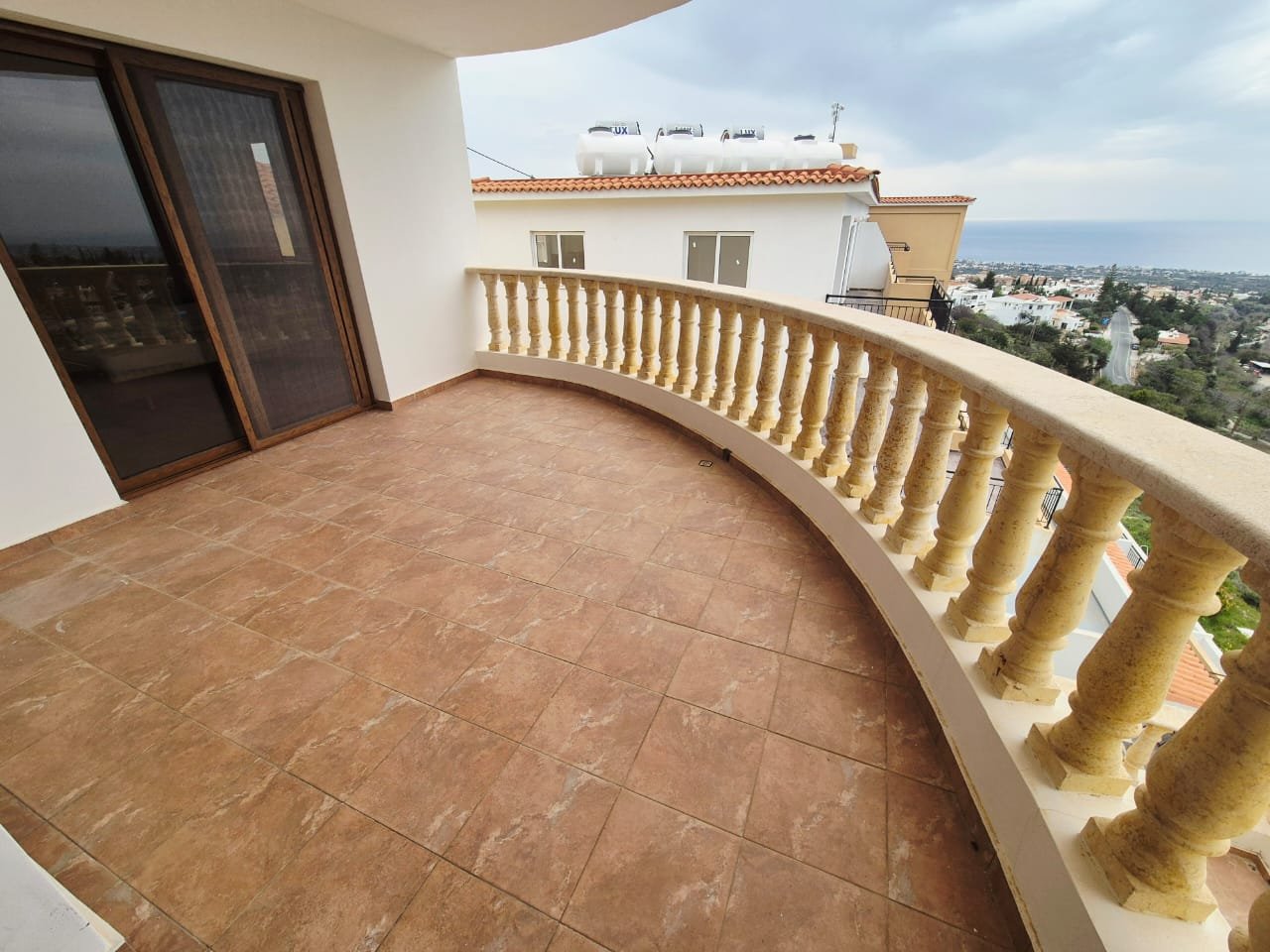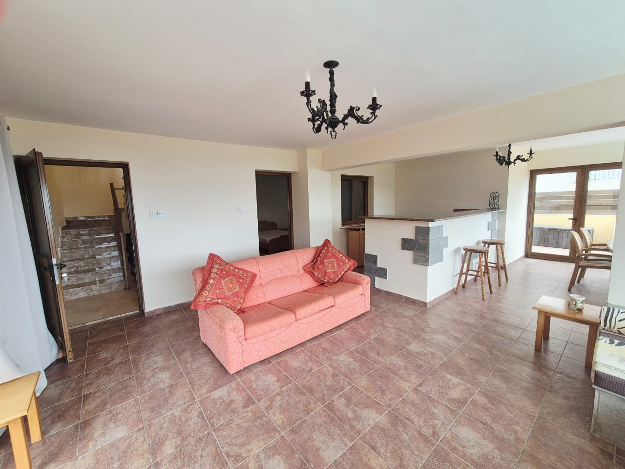 As you enter the villa, you walk into the open plan living room with a working fireplace and patio doors leading out to the balcony with amazing sea views.